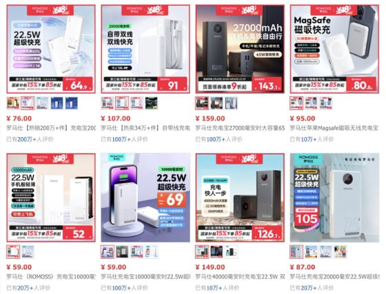 界面新闻注意到,目前电商平台上罗马仕20000毫安的充电宝是其自营旗舰店的爆款产品,热销200万件以上,22.5W快充售价为76元。此外,旗舰店内也有30W 20000毫安时以及65W 27000毫安时的充电宝有售,价格较22.5W稍高,分别为118元和147元。几款产品的累计评价数均在百万以上。